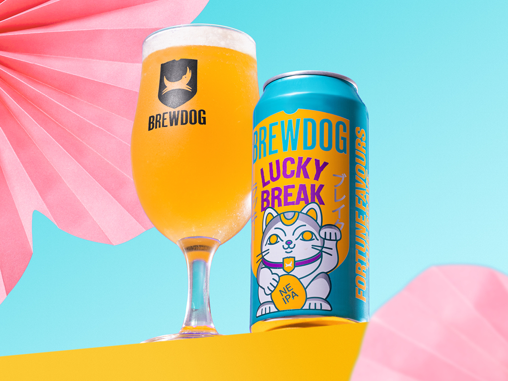 We were briefed to create a new product brand called 'Lucky Break' for BrewDog's 440ml range in grocery. A few potential routes were presented and this was the selected design playing into the maneki-neko character. This beer is sold in all major UK supermarkets.