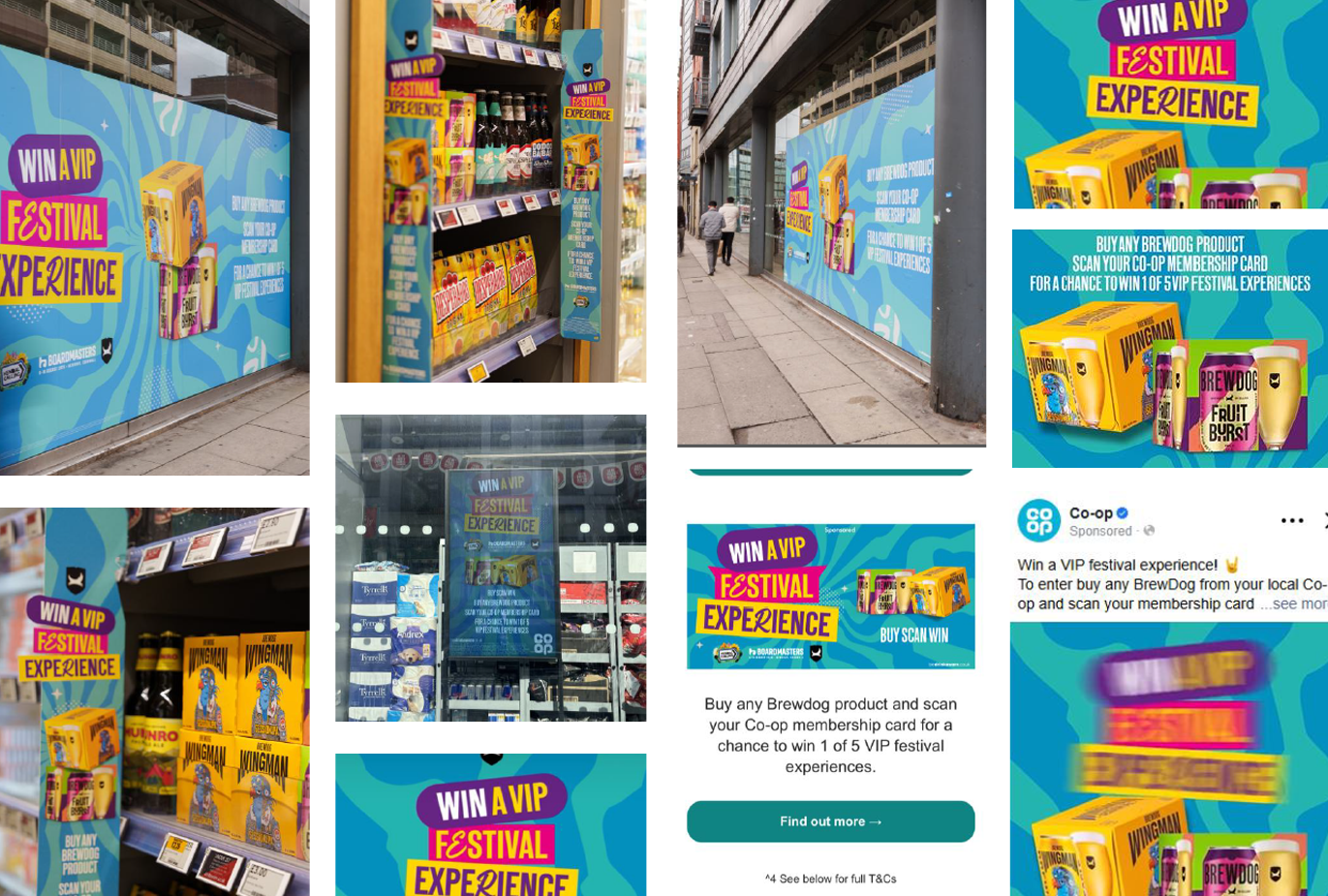 CO-OP partnered with BrewDog for an in-store festival activation as part of their CO-OP Member's programme. The concept we pitched was simple, buy BrewDog and scan your CO-OP Member's card for a chance to win tickets to Kendal Calling. I worked on the creative concept and provided various key visuals which were then rolled out by CO-OP's team across their sites.